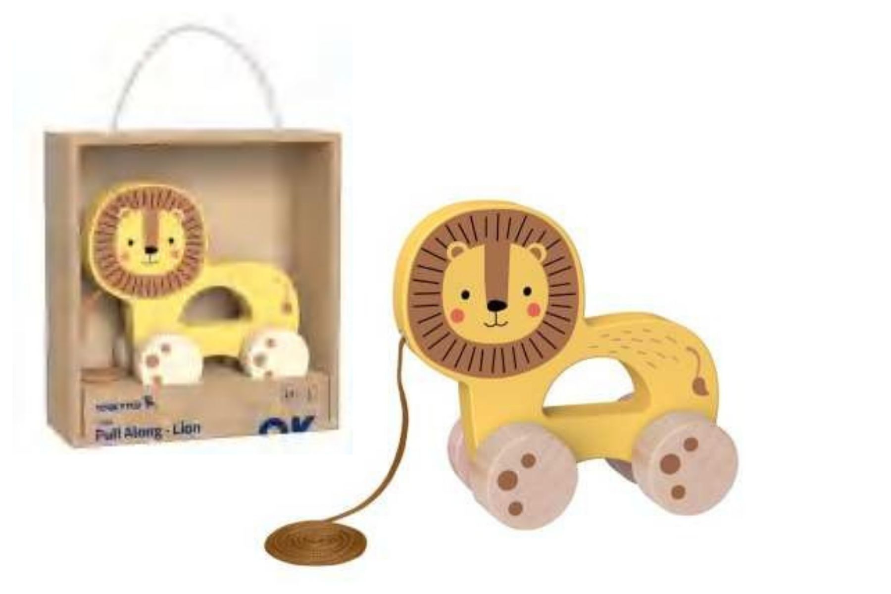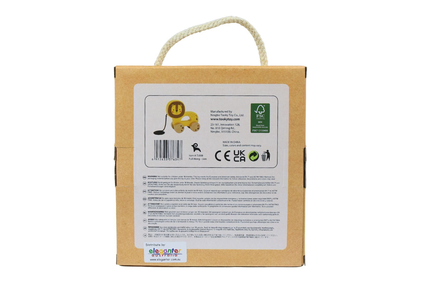 Tooky Toy's Pull Along Lion is a delightful and educational playmate tailor-made for young children. With its endearing lion design and smoothly rolling wheels, this toy is perfectly suited for toddlers learning to walk. The Lion's fixed leash at the front allows children to grasp it securely, creating a heartwarming scene as it faithfully trails behind, spreading joy and laughter. Beyond its playfulness, the Pull Along Lion serves as a valuable educational tool, aiding in the development of vital skills like hand-eye coordination and early walking abilities. Crafted from FSC certified timber, the toy reflects a commitment to responsible sourcing, promoting both environmental and social values. Parents can take comfort in the fact that this toy is adorned with child-safe, non-toxic paint, ensuring a wholesome and secure play experience. Its robust construction ensures durability, capable of withstanding the energetic play of young children while facilitating physical and cognitive growth. The Pull Along Lion is not only an entertaining companion but also a fantastic choice for parents seeking to foster their child's development in a safe and enjoyable way.